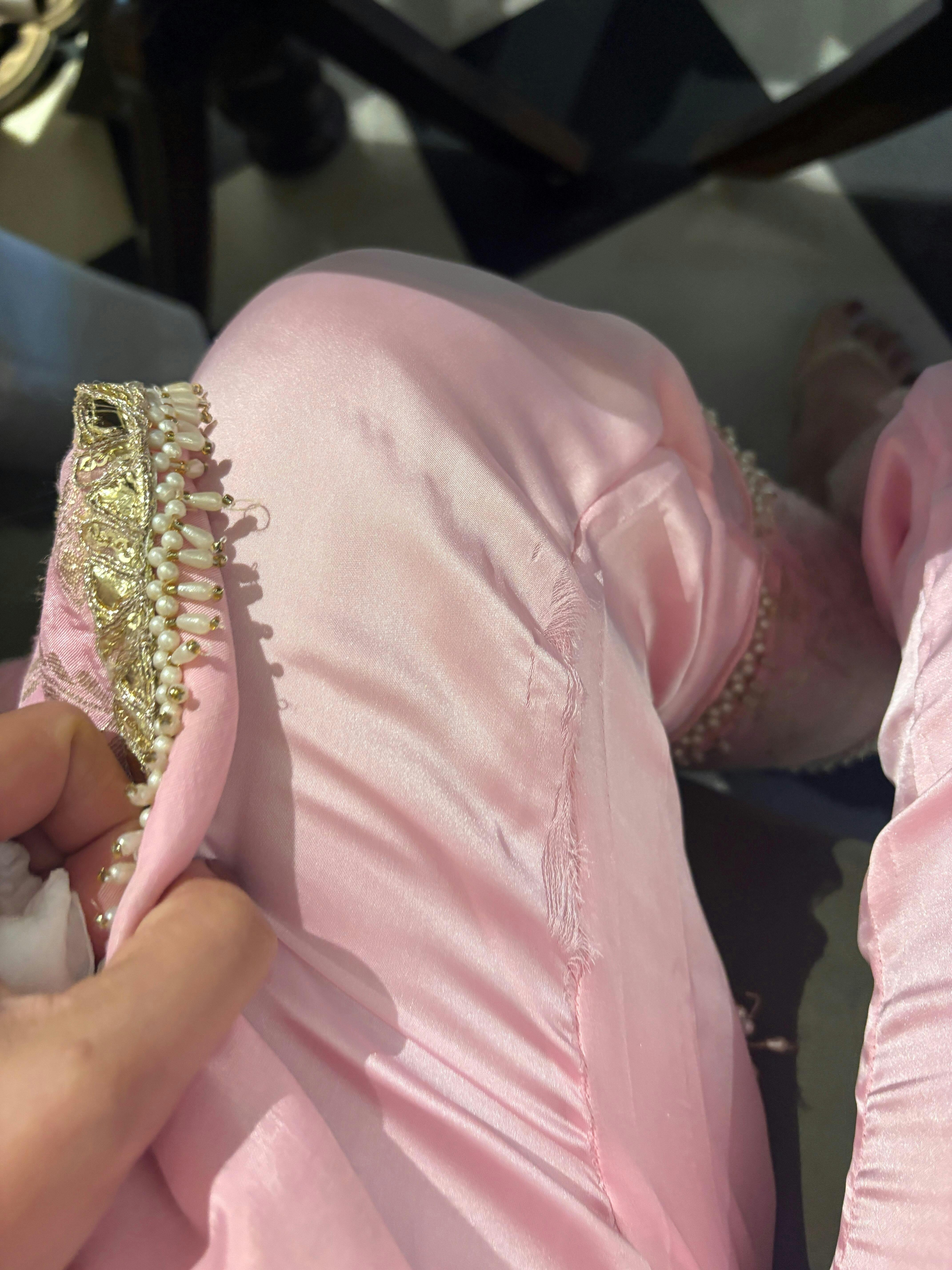 The sleek straight satin pants are the perfect complement to the kurta. The pants feature details of brocade and pearl laces, creating a sleek and sophisticated look.
