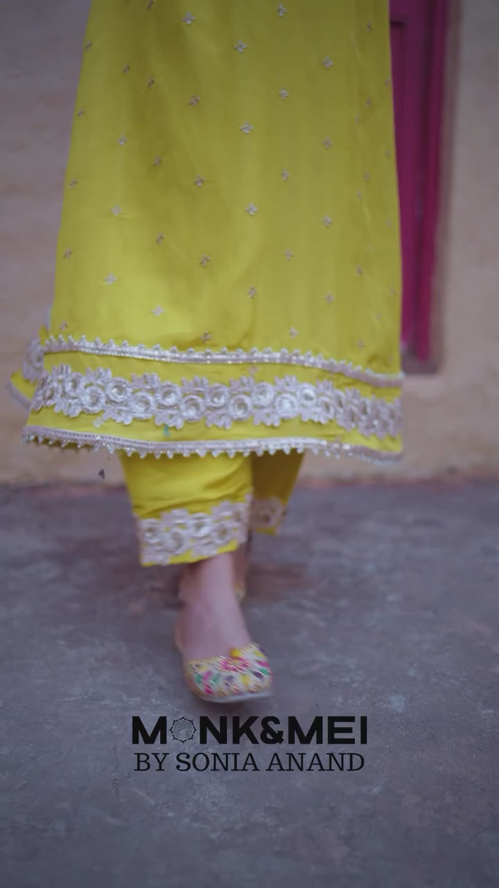 Choga-style kurta in soft Banarasi tissue, featuring a Deep scoop pointed U shaped neckline and relaxed kimono sleeves. Delicate buttie work and subtle side slits add ease, charm, and graceful movement. Paired with a classic salwar that keeps the silhouette traditional yet effortless. A dreamy, regal set perfect for intimate festivities and slow, magical evenings.